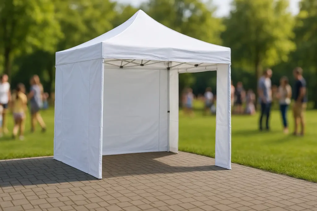 Wetterfeste 3×3 m und 3×6 m-Zelte mit Panorama-Fenstern oder geschlossenen Seitenwänden.